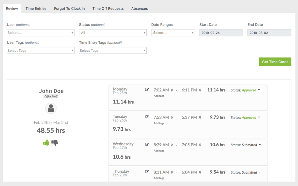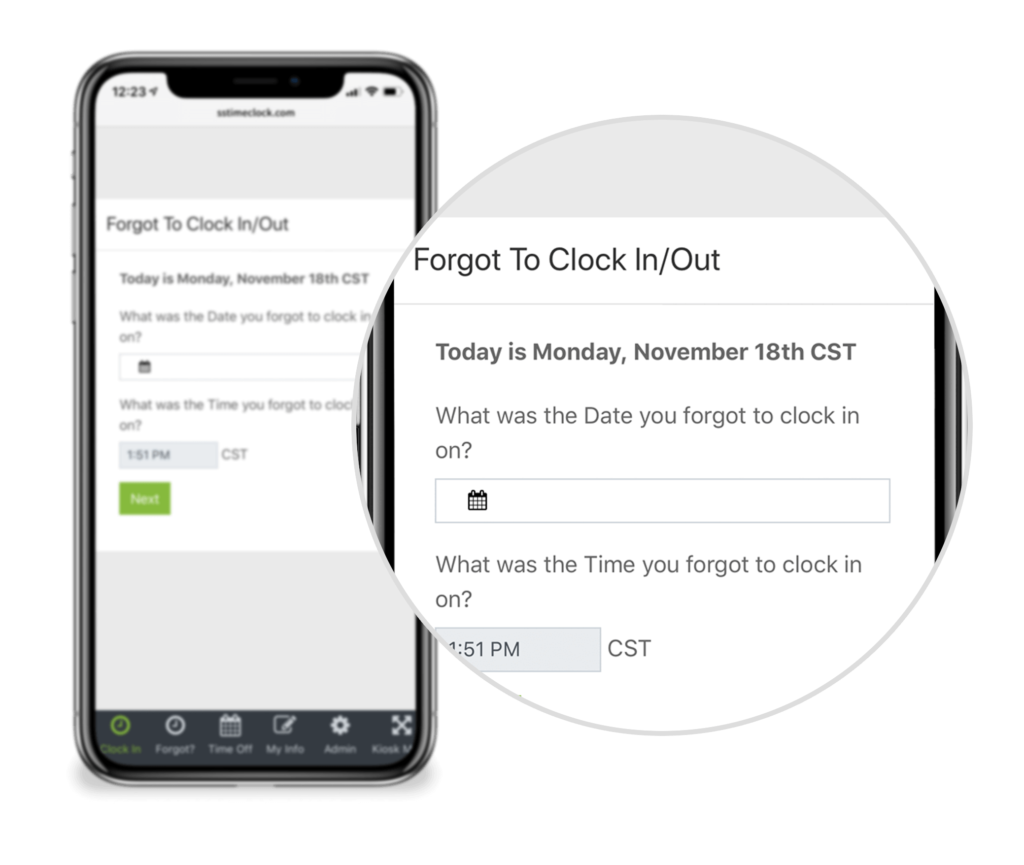 Allow your employees to request a manual time entry for missed punches with our forgot to clock in / out feature.