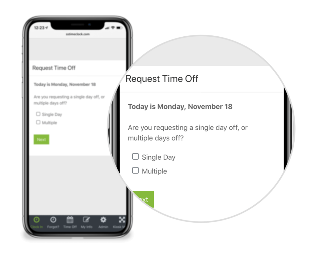 Paid & Unpaid time off is requested from the employee home screen. Single & multiple days can be selected.