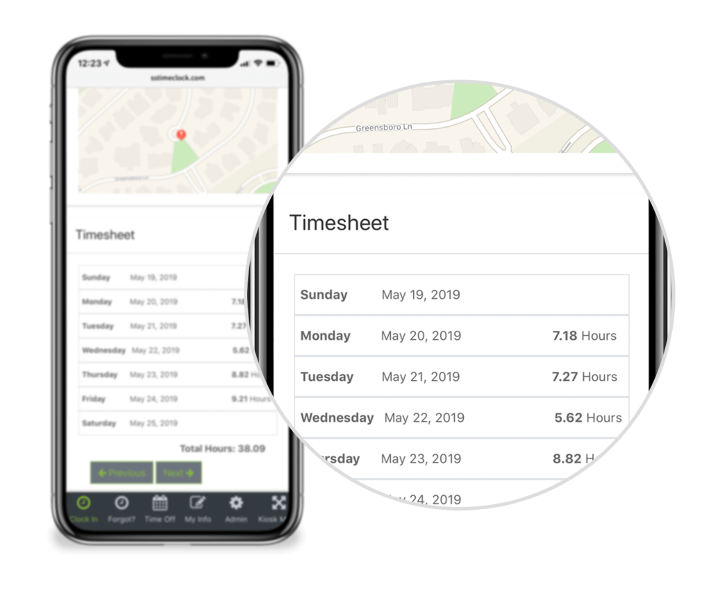 Upon entering their pin, employees will be able to scroll through prior time cards to view previous time entries.
