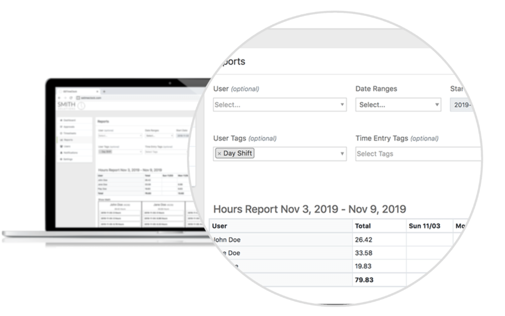 Timeshift tags allow you to organizing departments, form teams, run custom reports, track project or job sites.