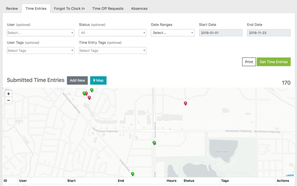 Track the GPS location of where an employee clocks in or out at. View multiple employees at once to find inaccuracies.